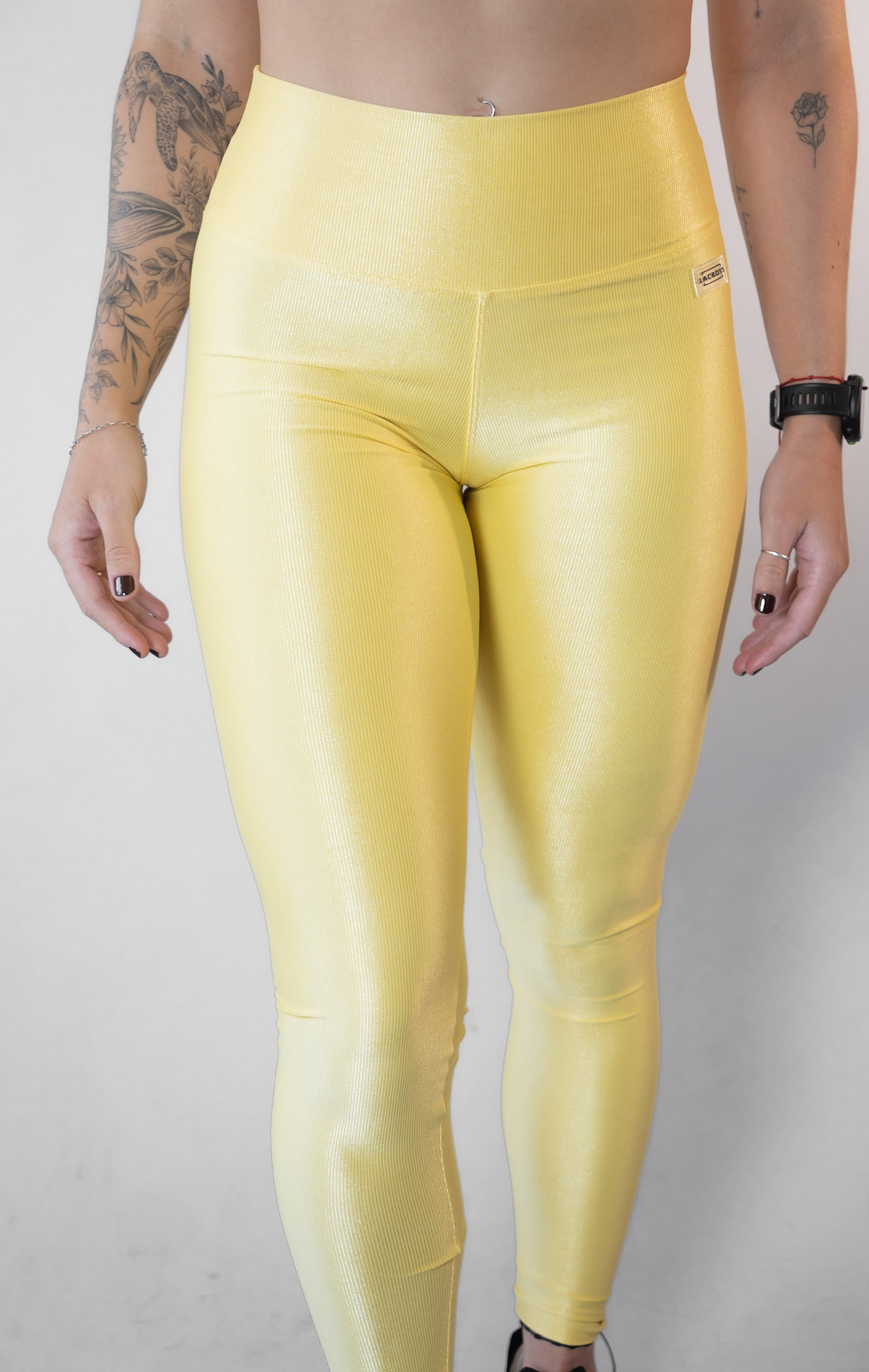Legging Move possui cintura alta com acabamento brilhante e textura canelada.